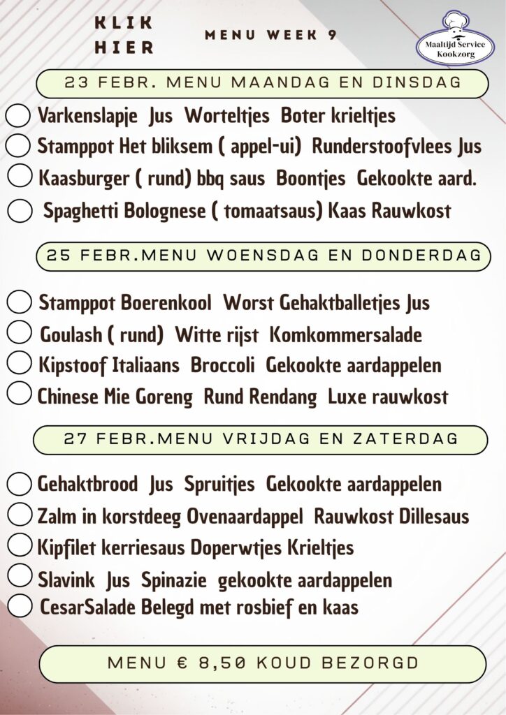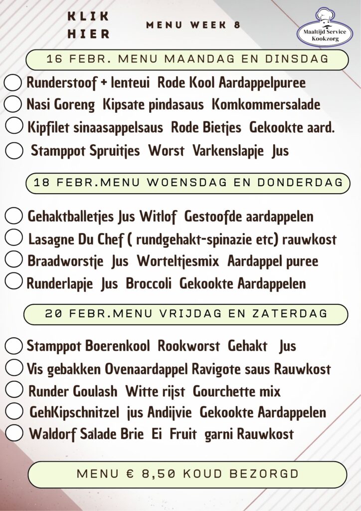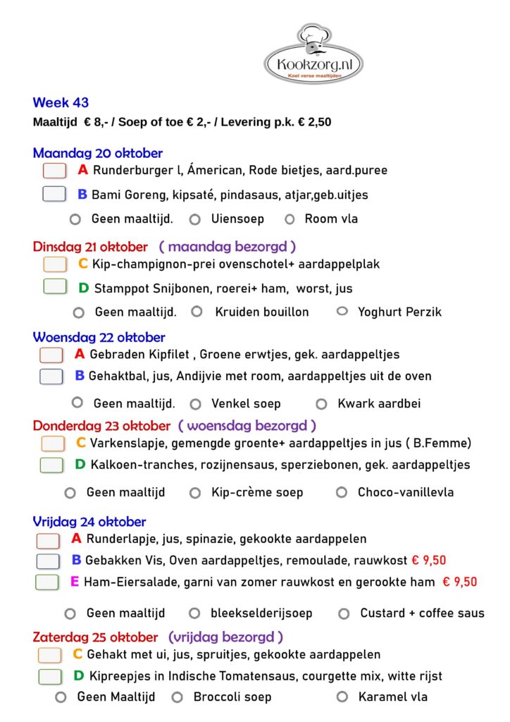 Menukaarten worden Woensdag meegegeven voor het menu 2 weken erna. De ingevulde menukaarten graag in het tasje retour naar de keuken